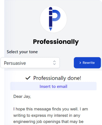 Professionally is an absolute game-changer for business communication. Its ability to adapt emails according to the desired tone is simply fantastic. I've seen an improvement in my professional relationships ever since I started using it. Highly recommended!